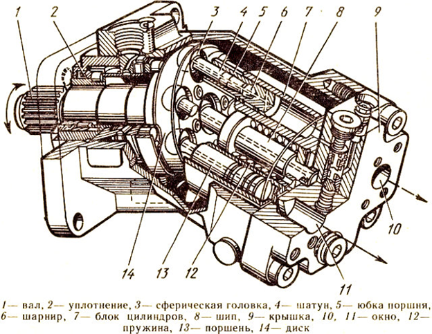 Аксиально-поршневые агрегаты отличаются значительным КПД и дают возможность точно регулировать расход. Поршни, расположенные в цилиндрах, совершают возвратно-поступательные движения за счет наклонного диска, преобразуя вращение вала в циклы всасывания и нагнетания.